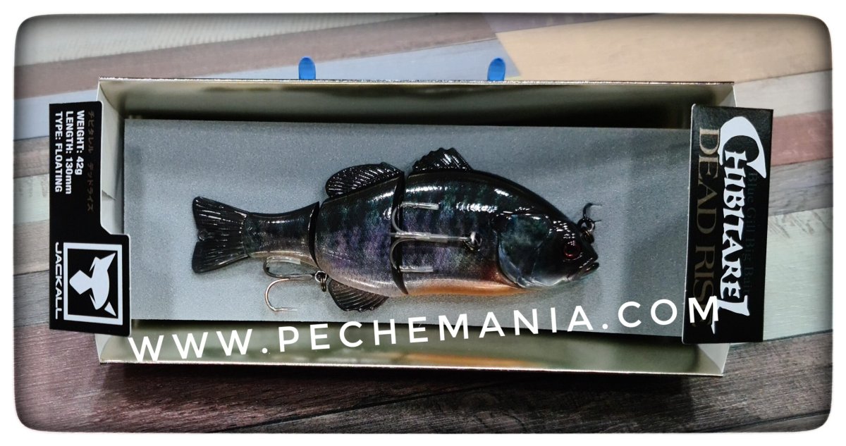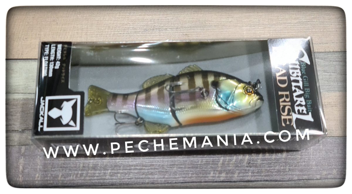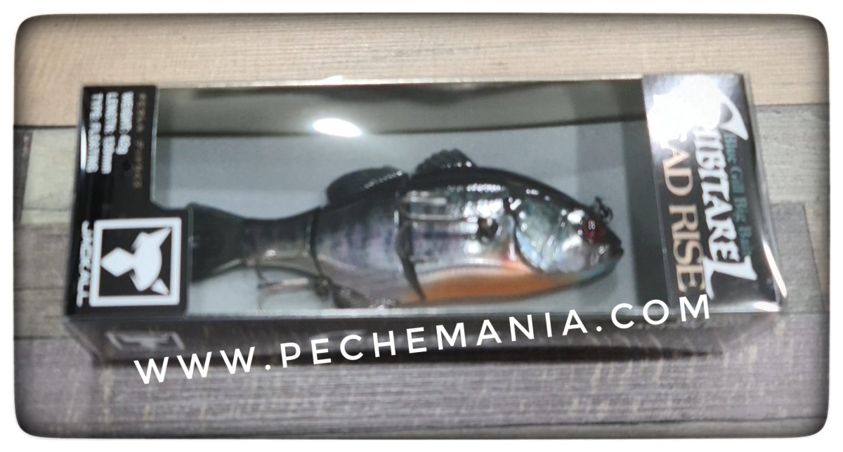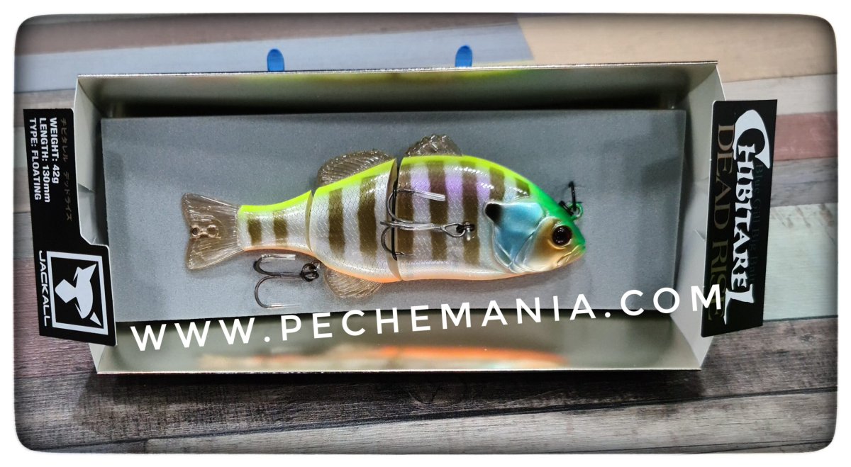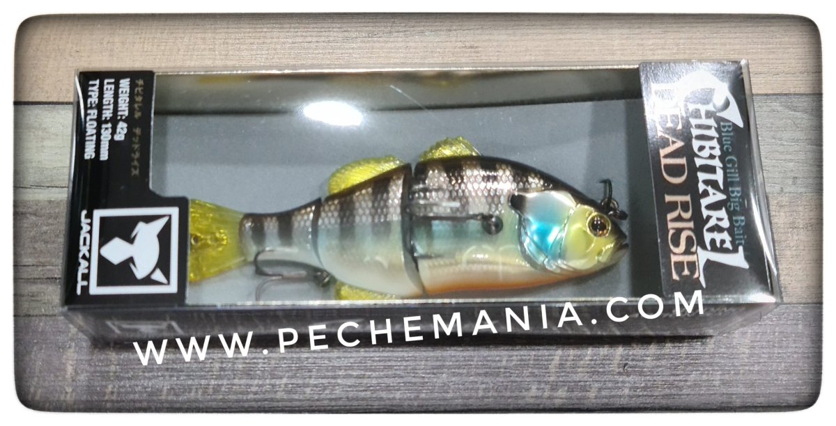 Jackall CHIBITAREL DEADRISE imitates the weakened bluegill perfectly with the following features.1.Deadly rising action is performed when the retrieve is stopped. The shimmy rising movement is just like the weakened bluegill.2.Makes smooth gliding movement in modicum speed retrieve to imitate the escaping bluegill, and unique vertical gliding movement in slow retrieve to imitate the weakened bluegill.3.Jackall cares much about the front hook position, that is side of the body. This front hook is located at the side where fish attacks from below in order to perform the perfect hooking.4.Best floating posture is realized by the good balance of build in weight and hook size. The part of the backside of the bait comes out of the surface.5.Swivel eye for the rear hook increases the catching rate of the big bass.6.Sight marker is made in the joint part for RT Pond Gill/RT Spawn DR Gill/Uroko HL DR Gill colors.