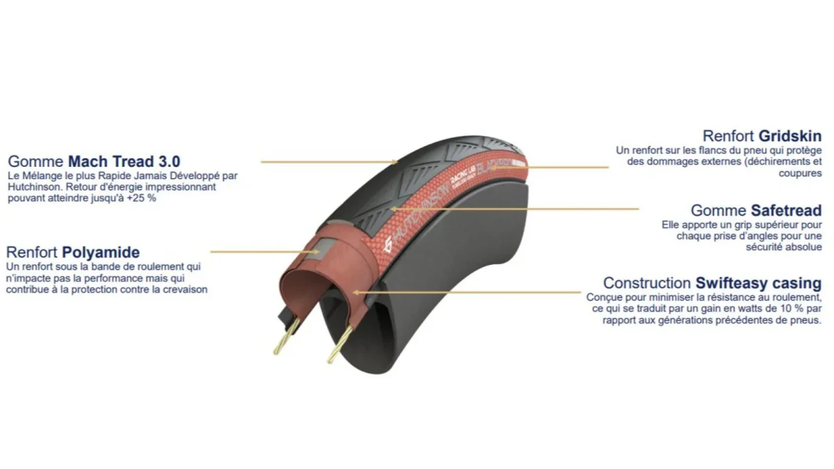 - La nouvelle gomme MachTread 3.0 offre un transfert d’énergie amélioré de 25 % par rapport aux générations précédentes, garantissant un rendement optimal. Avec une résistance au roulement équivalente à celle du GP5000, ce composé innovant est le plus rapide et le plus performant jamais développé par Hutchinson, alliant efficacité et dynamisme sur la route.