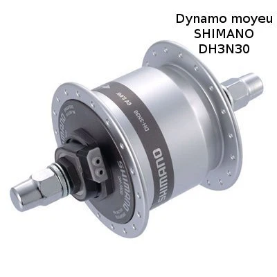 La roue dispose d’un moyeu dynamo Shimano DH 3N30 équipé d’un système de serrage rapide d’un entraxe de 105 mm. La dynamo est en aluminium. Elle est équipée d’une protection contre la surtension et elle résiste à l’oxydation. La roue complète pèse 1700 gr.