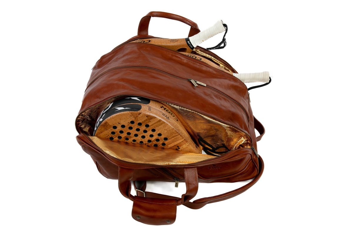 Thermobag fait à la main en cuir véritable, avec la marque CORK PADEL gravée.